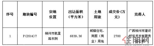 3月18日,柳州市2014年第6期国有建设用地使用权交易会在柳州市土地交易储备中心举行。本次交易会推出P(2014)7号地块,其位于柳州市航星路东侧,地块面积为6839.36㎡(约10.26亩),此地块在出让当天以直接签订协议的方式,由广西柳州市建设投资开发有限责任公司以底价2700万元成功竞得。